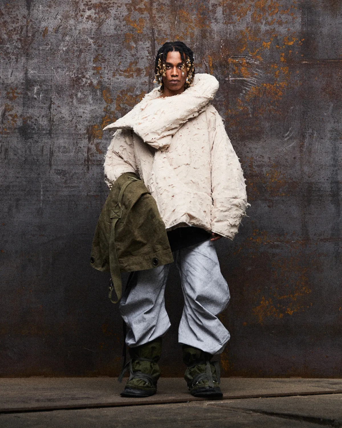 Last Refuge explores clothing as a form of protection, a personal shelter carried on the body. The collection combines durable, functional textiles with repurposed elements, including selected military surplus, creating garments that balance utility and vulnerability.