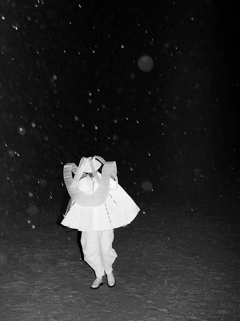 Inspired by space travel, this look serves as a study of isolation, protection, and exploration. Its sculptural form echoes astronaut gear and orbital structures, blending futuristic aesthetics with a sense of survival and wonder beyond Earth.