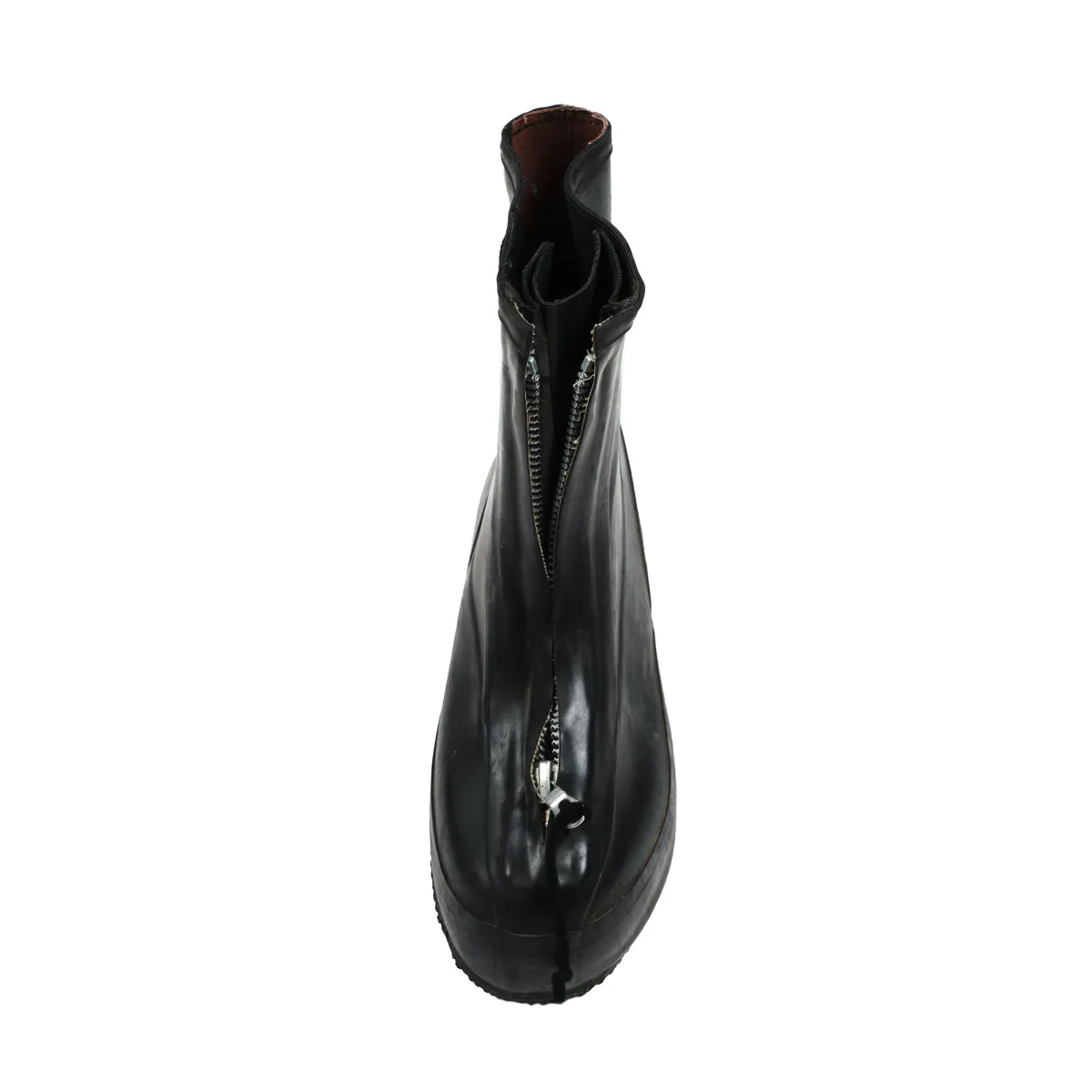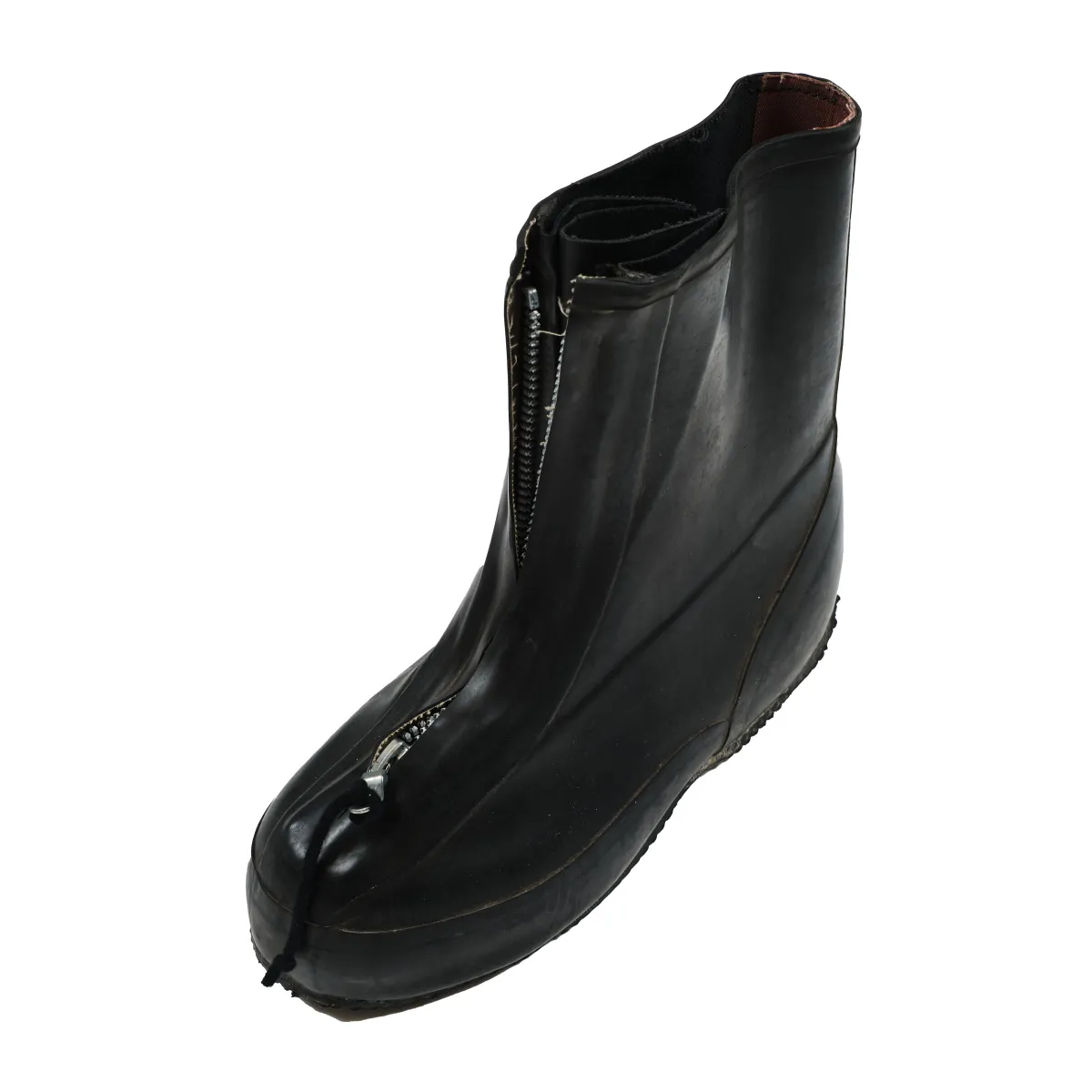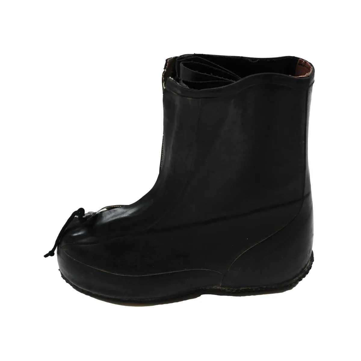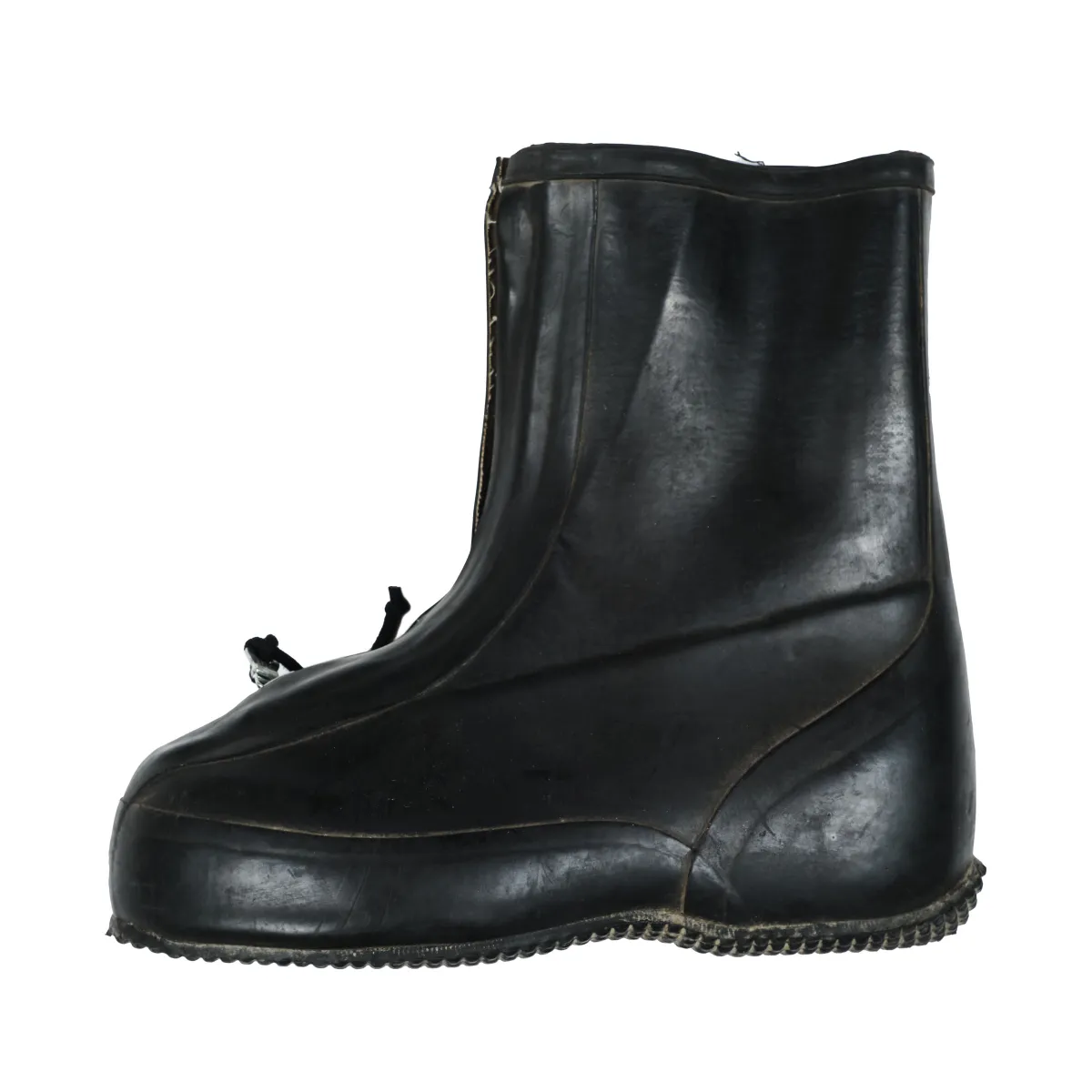 Military-issued protective overboots designed for use in hazardous environments. Made from molded rubber with a textured sole for traction, they offer resistance against chemical agents and moisture. Functional details include adjustable straps and a wide opening for quick layering over standard footwear. Originally engineered for defense, reimagined for utility-driven styling.