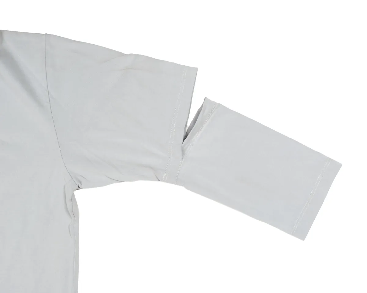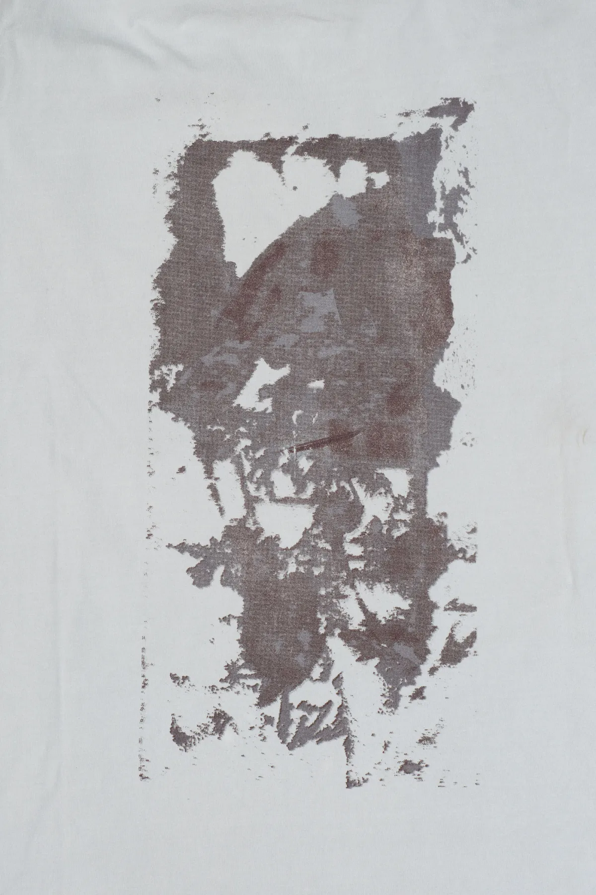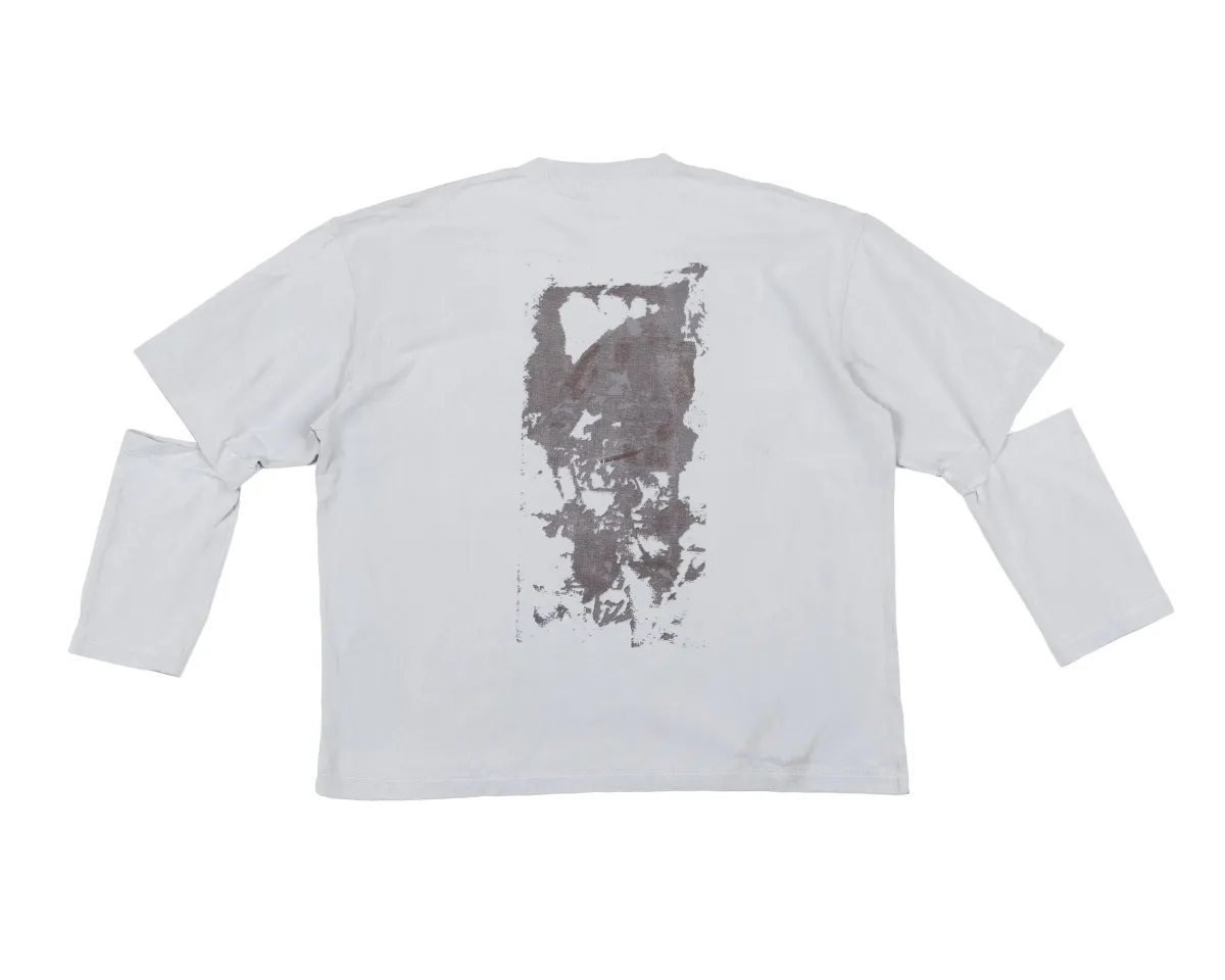 Boxy-fit long sleeve tee with elbow slits, crafted from mid-weight cotton jersey. Features a clean front with subtle dual-label detailing near the hem. The back is printed with a distressed rectangular graphic, evoking worn surfaces and decayed textures. Garment-dyed for a washed, lived-in finish that enhances the abstract print. A minimal essential with quiet depth — designed to layer or stand alone.