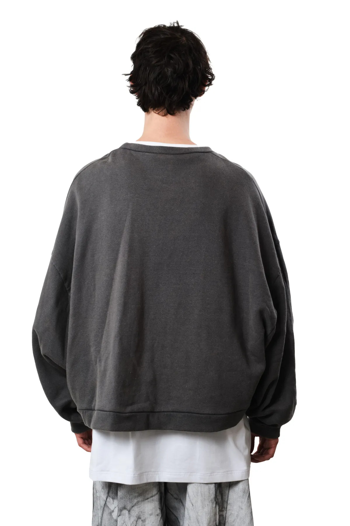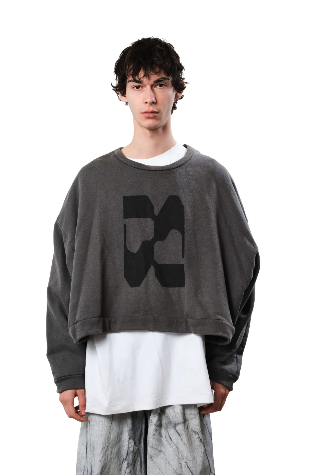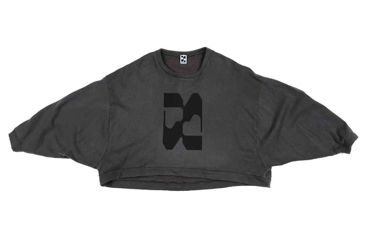 Cropped crewneck sweatshirt with a bold batwing silhouette and exaggerated dropped shoulders for an architectural, oversized fit. Crafted from soft cotton fleece and finished with an ozone treatment for a uniquely faded black tone that’s both low-impact and visually rich. A tonal WRTMN logo is screenprinted at the chest, adding subtle branding to the sculptural form.
