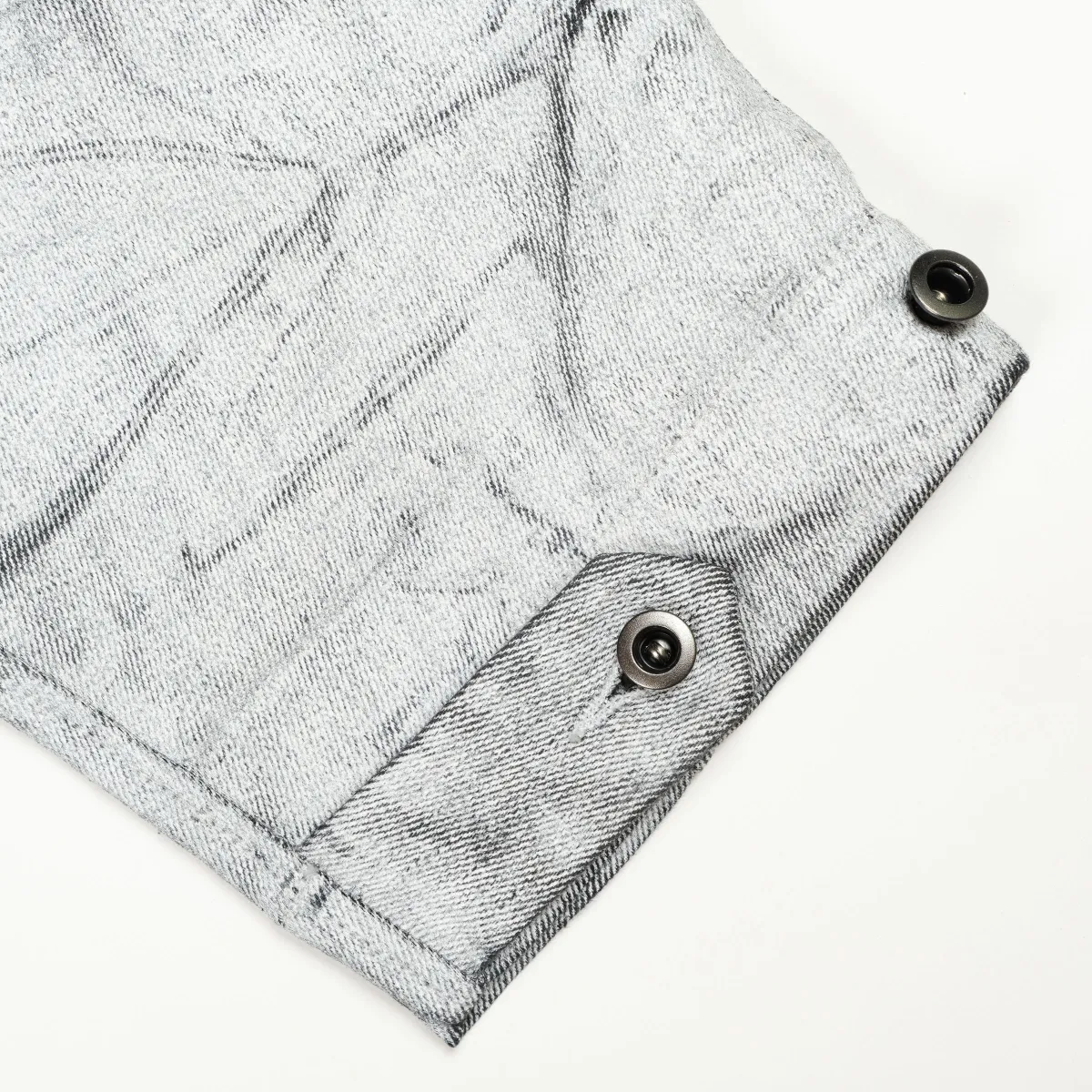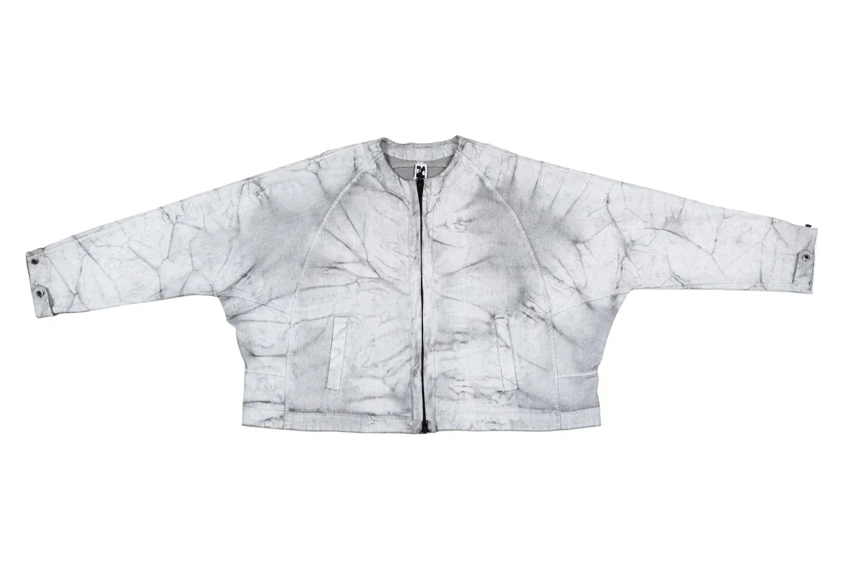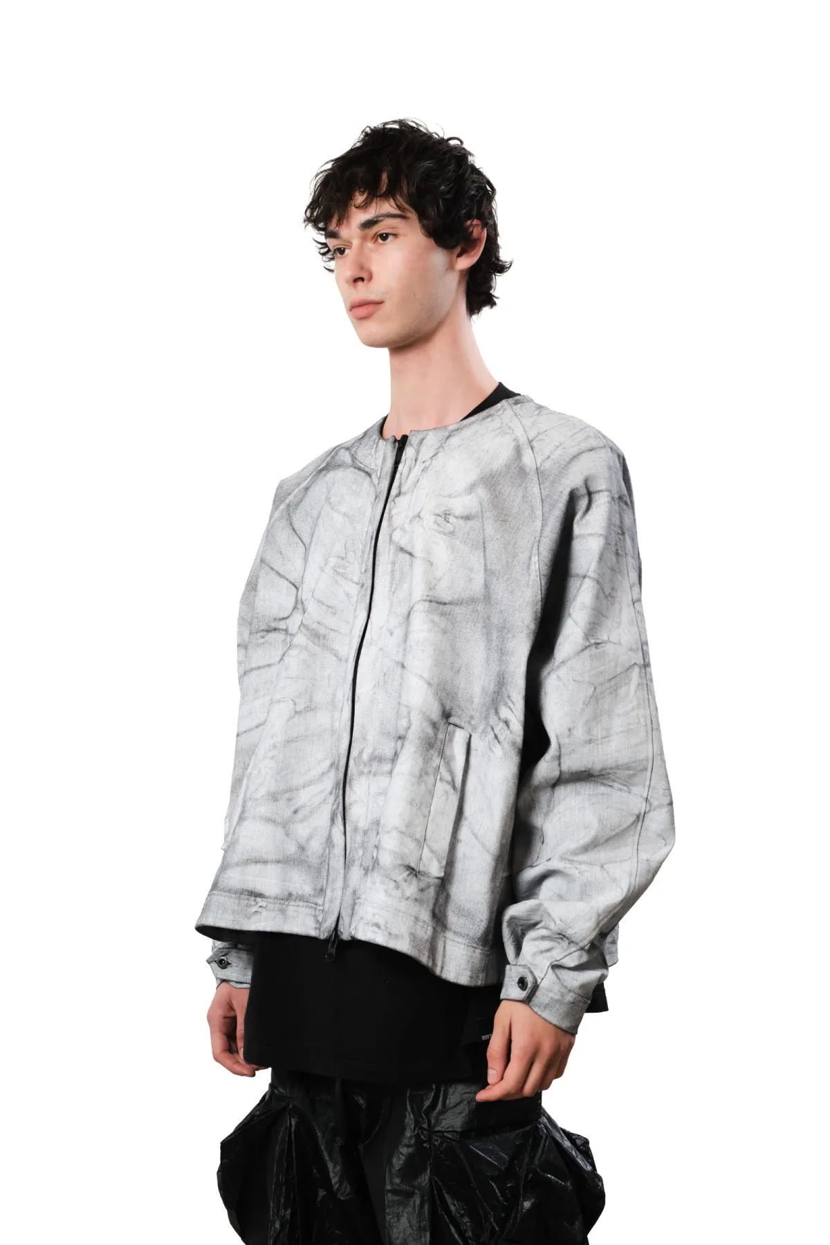 Boxy-fit zip jacket crafted from coated denim, finished with a custom marble wash that brings out natural textures and tonal depth. The construction is inspired by early Arctic expedition garments, featuring curved paneling and raglan-style sleeves for easy movement. Designed with a minimal collarless neckline, angled side pockets, and button cuffs. A utilitarian outer layer reimagined with sculptural form and surface experimentation.