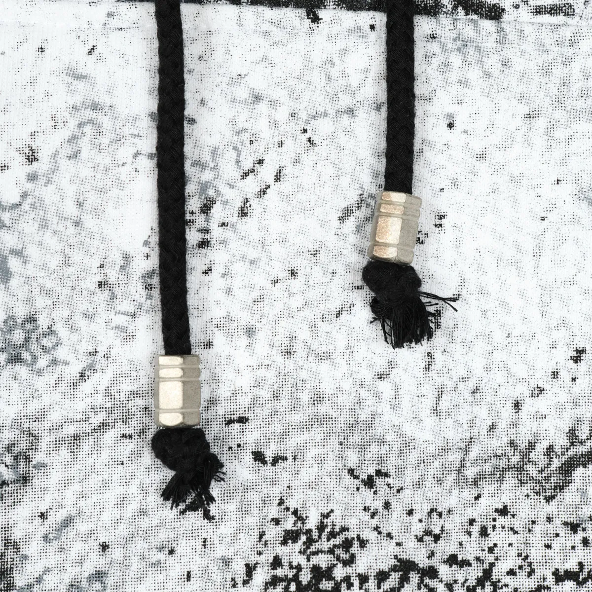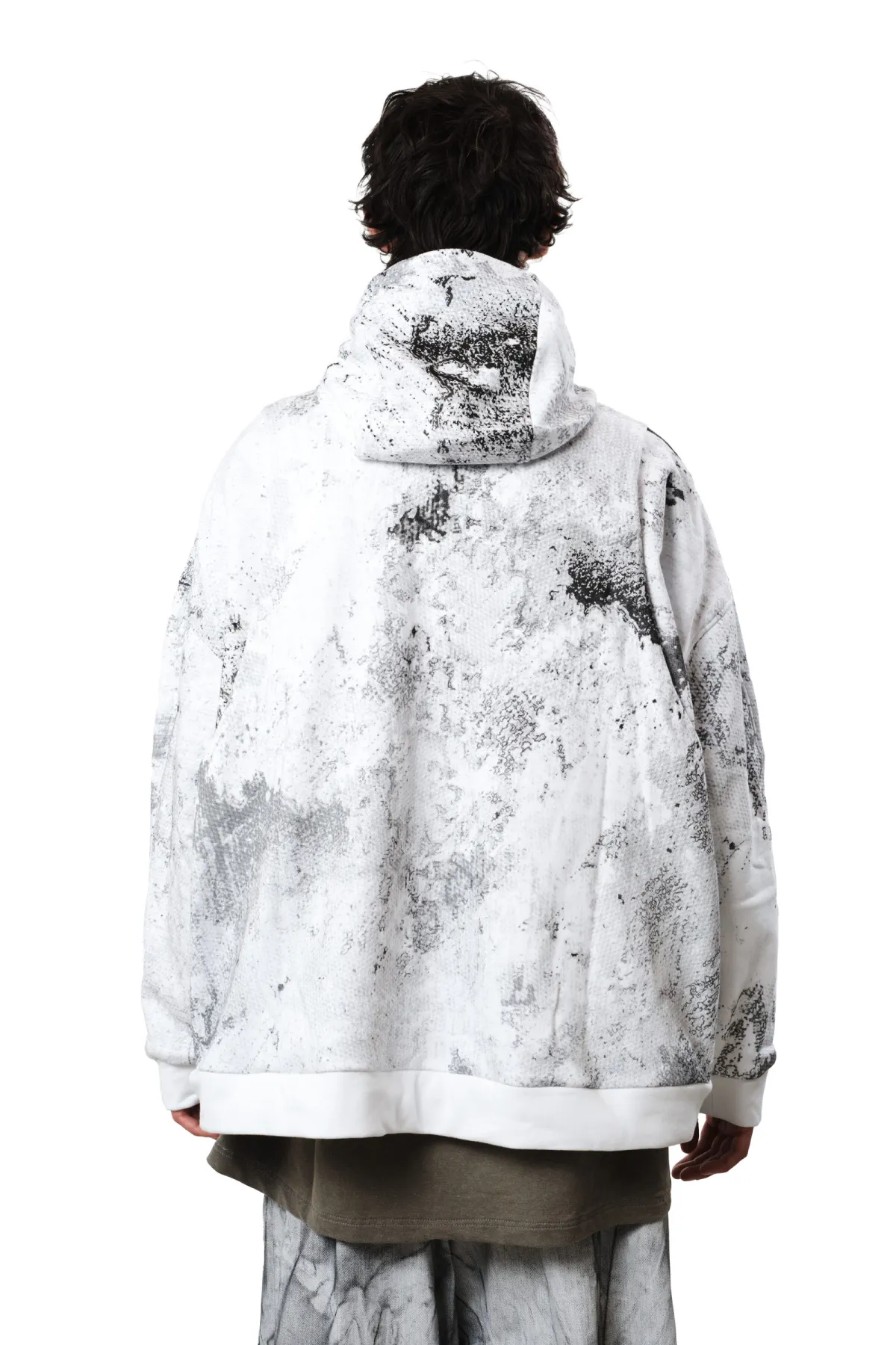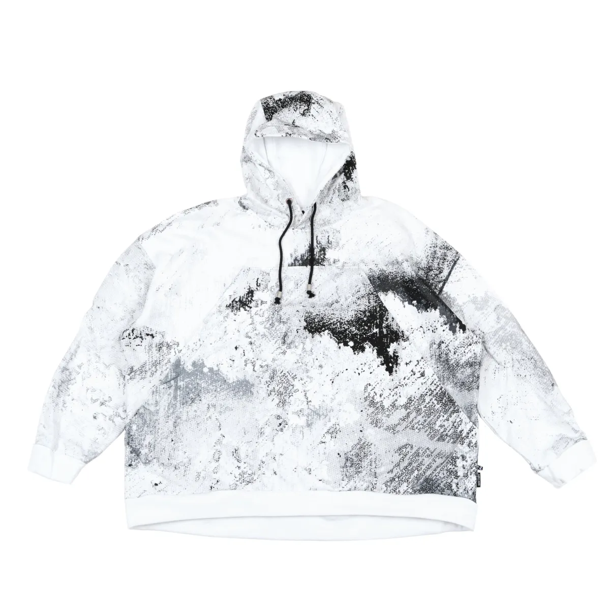 Oversized hoodie featuring an expressive all-over monochrome print reminiscent of textured stone and weathered surfaces. Designed for comfort and visual impact, it includes a spacious front pocket and subtle double fake vents on the back. The adjustable hood comes with cord straps tipped in matte metal trims. The unique print design was created by Balazs Milanik and screenprinted by Biquet Studio, ensuring each piece carries a bold yet refined identity.