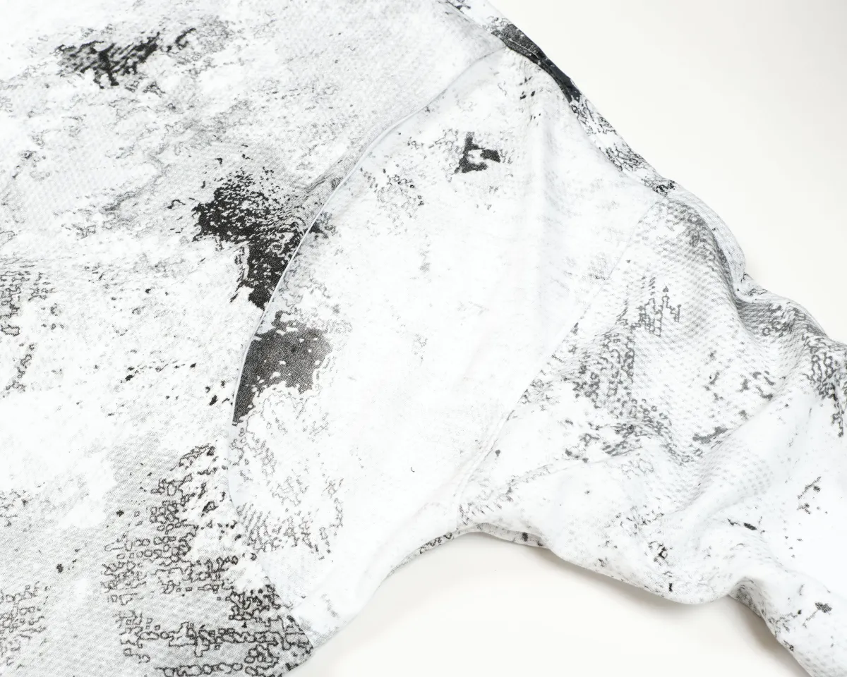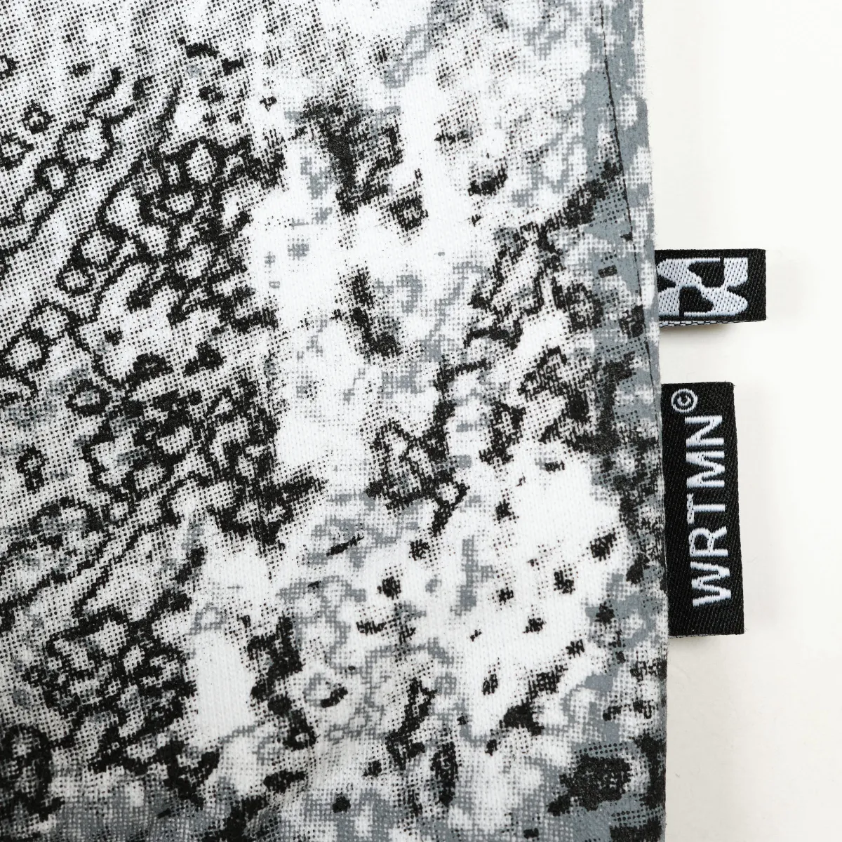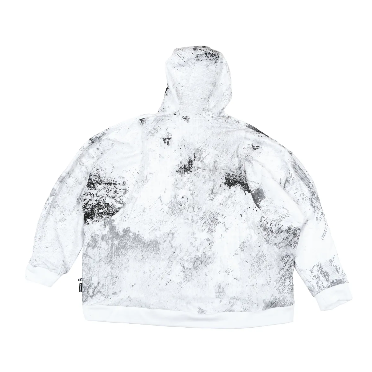 Oversized hoodie featuring an expressive all-over monochrome print reminiscent of textured stone and weathered surfaces. Designed for comfort and visual impact, it includes a spacious front pocket and subtle double fake vents on the back. The adjustable hood comes with cord straps tipped in matte metal trims. The unique print design was created by Balazs Milanik and screenprinted by Biquet Studio, ensuring each piece carries a bold yet refined identity.