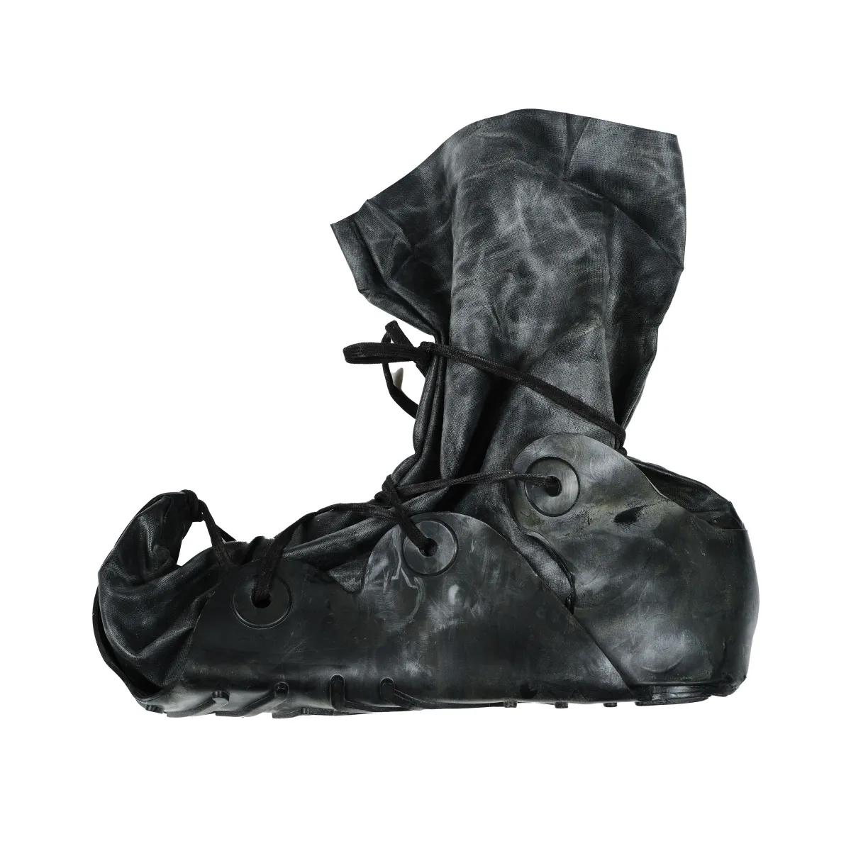 Military-issued protective overboots designed for use in hazardous environments. Made from molded rubber with a textured sole for traction, they offer resistance against chemical agents and moisture. Functional details include adjustable straps and a wide opening for quick layering over standard footwear. Originally engineered for defense, reimagined for utility-driven styling. Contained in original packaging.
