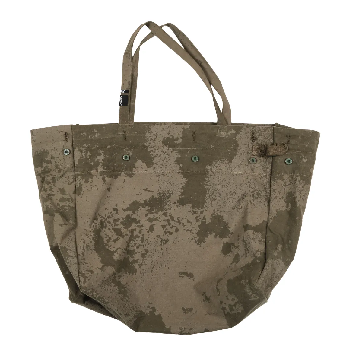 Oversized tote bag crafted from upcycled surplus military tent canvas, offering durability with a story. Features a tonal laser-etched print that mimics organic wear and weathered textures. The large-volume shape makes it ideal for styling, daily carry, or travel — blending function, material history, and surface experimentation.