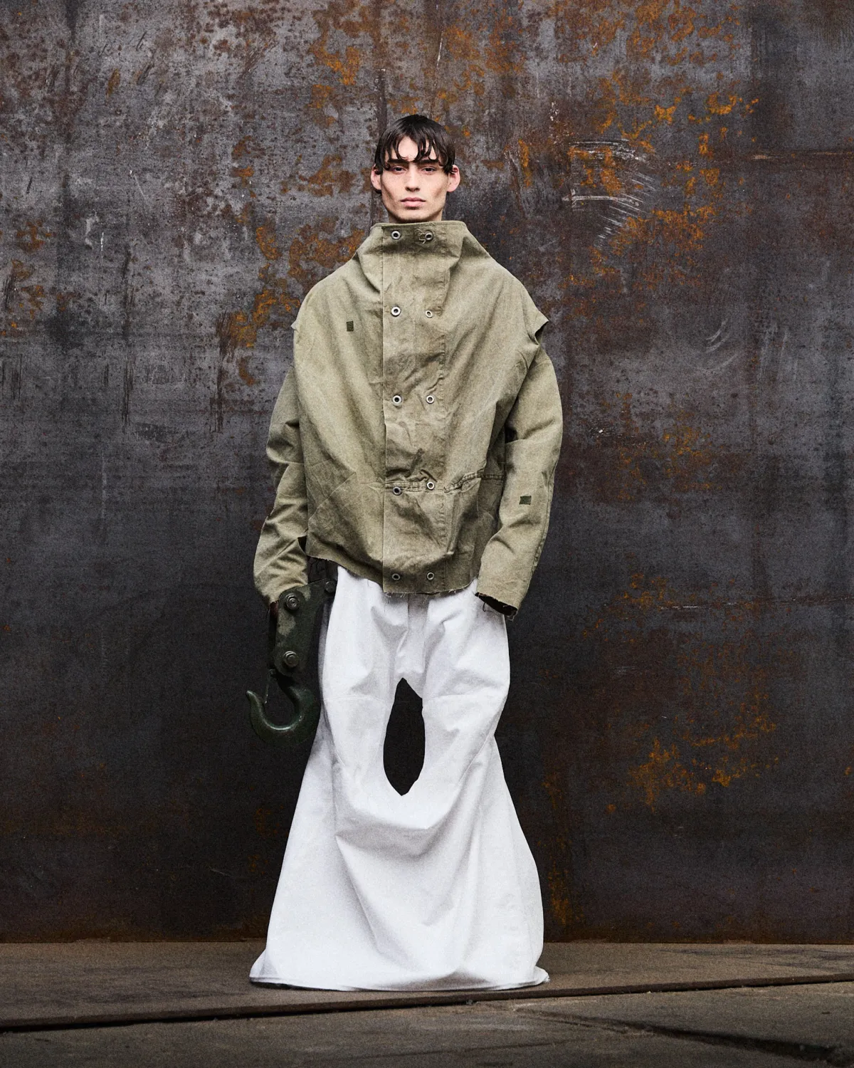 Last Refuge explores clothing as a form of protection, a personal shelter carried on the body. The collection combines durable, functional textiles with repurposed elements, including selected military surplus, creating garments that balance utility and vulnerability.