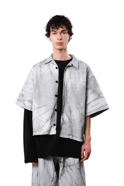 [ Boxy Coated Denim Shirt — Marble Wash ]