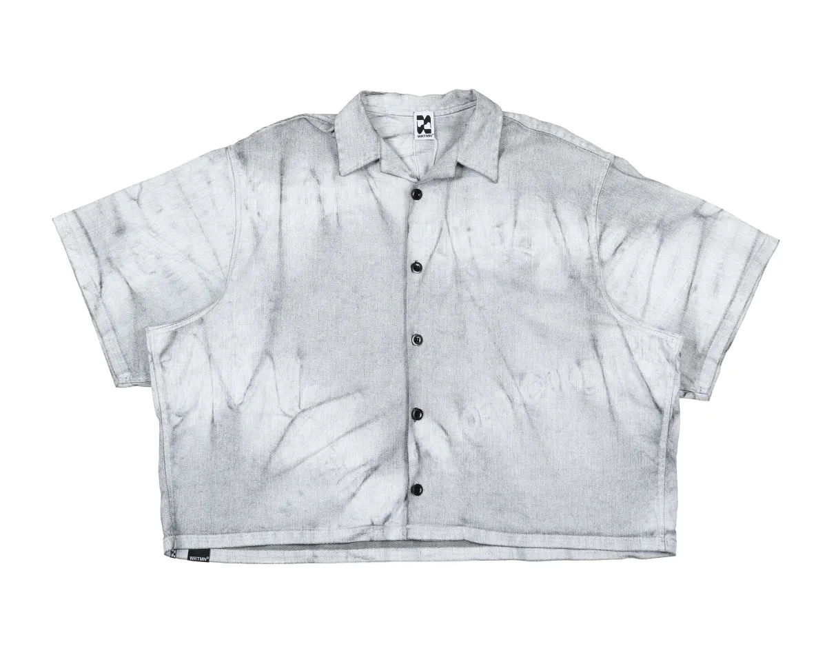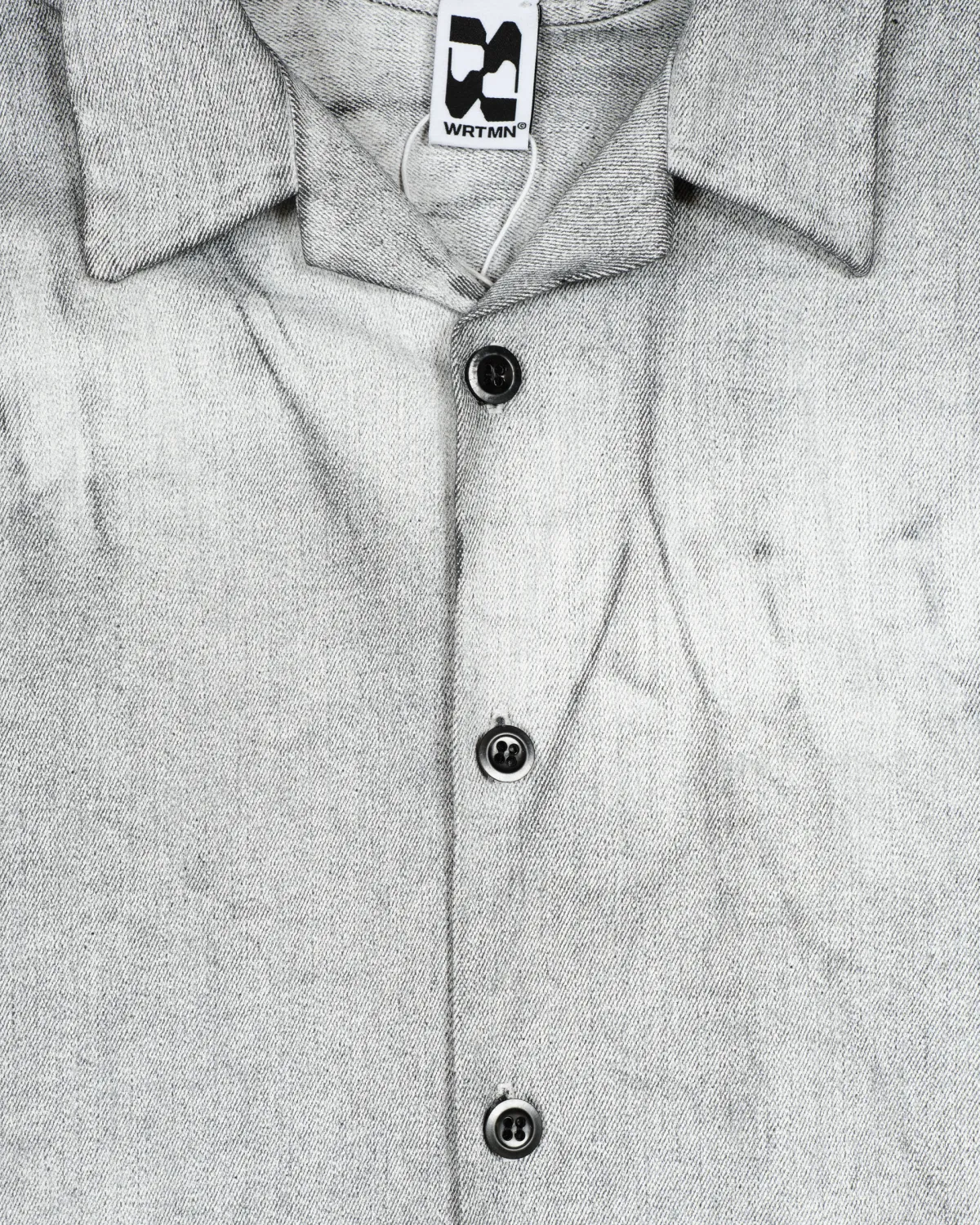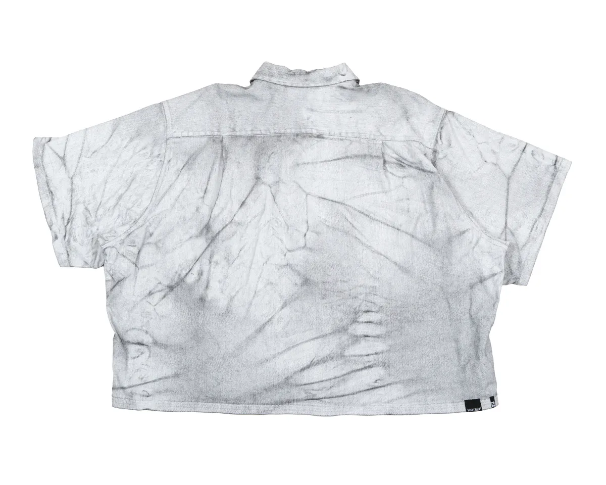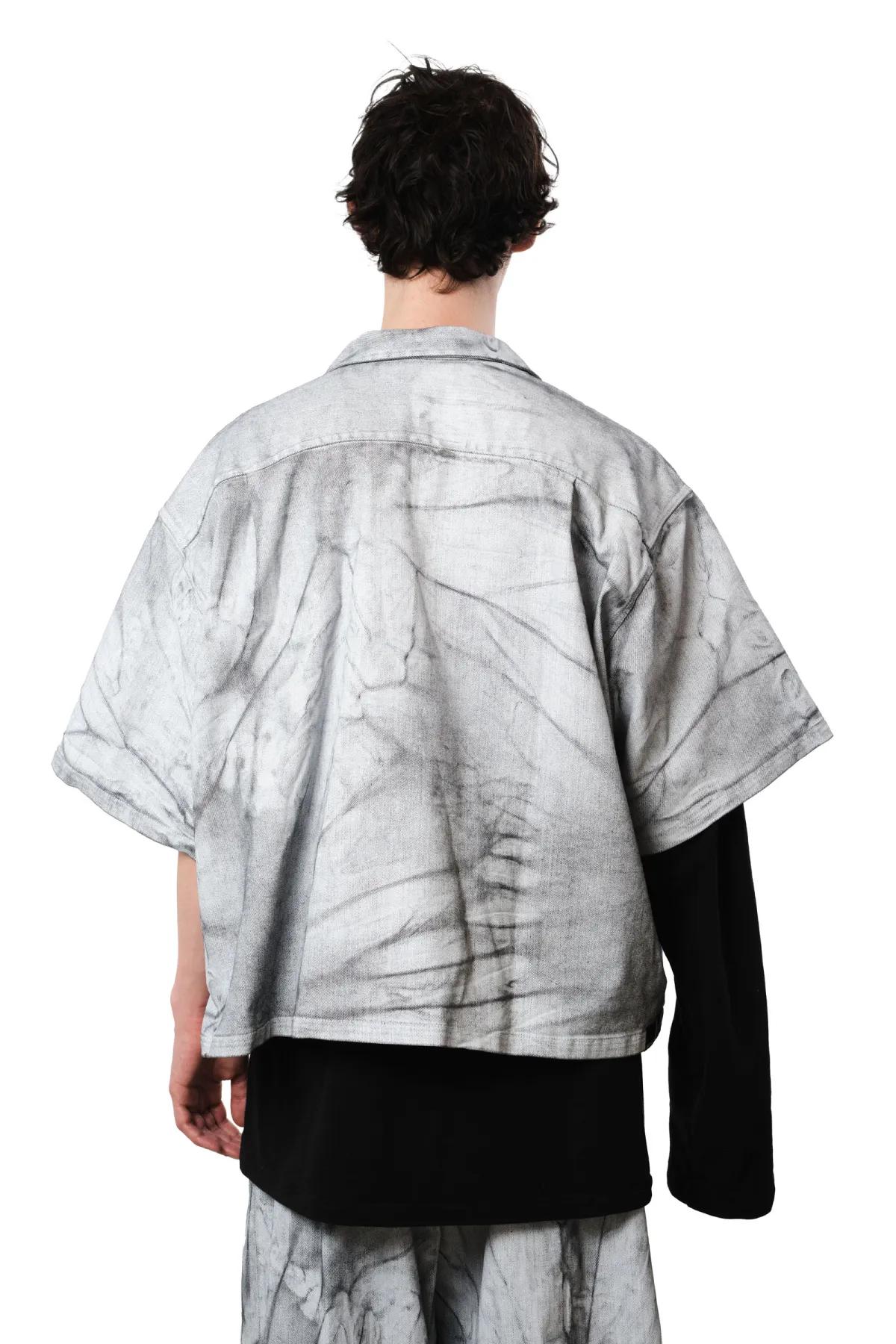 Short-sleeve button-up shirt with a sharp boxy cut, crafted from coated denim and washed for a marbled, stone-like finish. Designed with dropped shoulders and a structured drape for a relaxed yet refined silhouette. Minimal detailing keeps the focus on the fabric’s unique texture. A versatile layering piece that adds a sculptural, modern edge to any look.