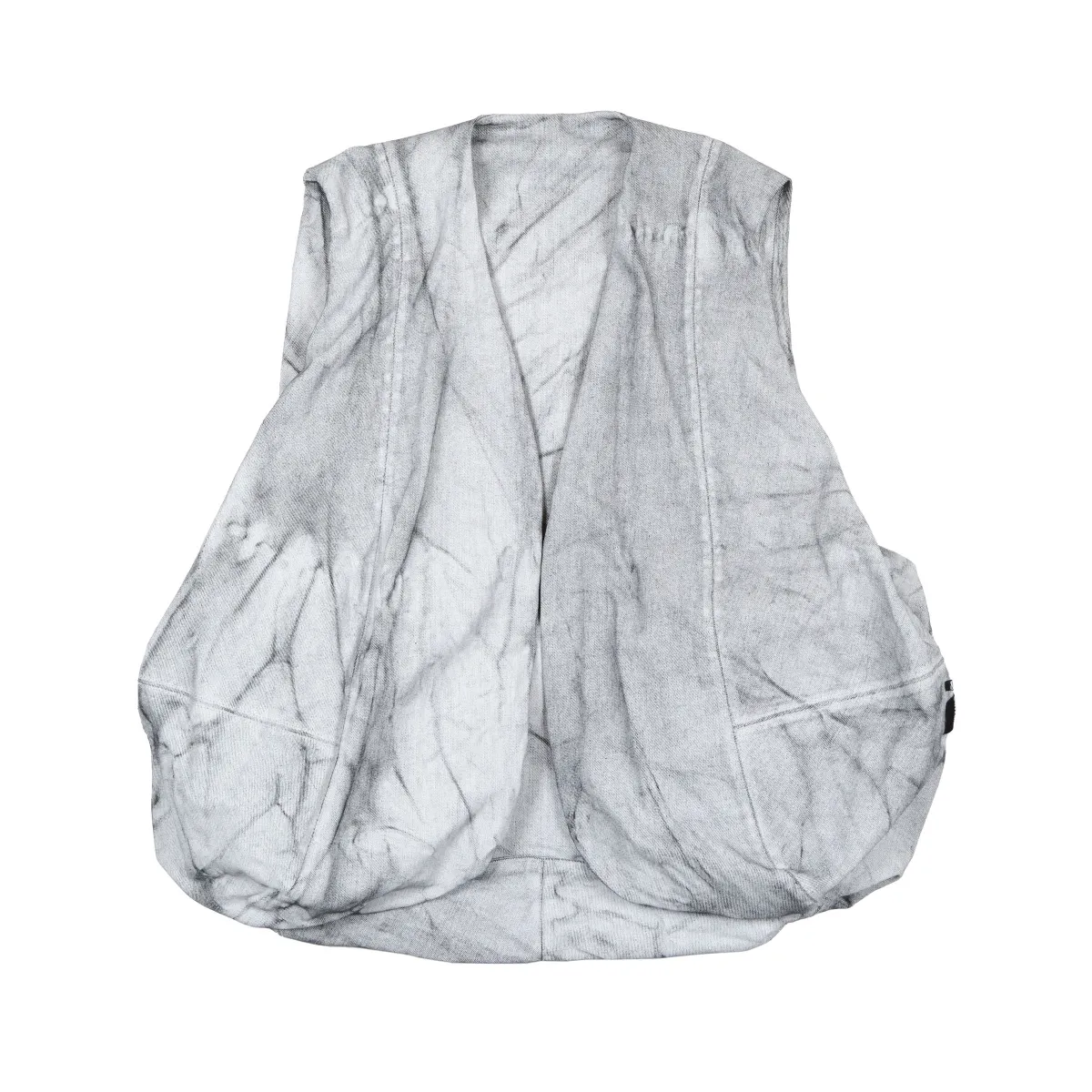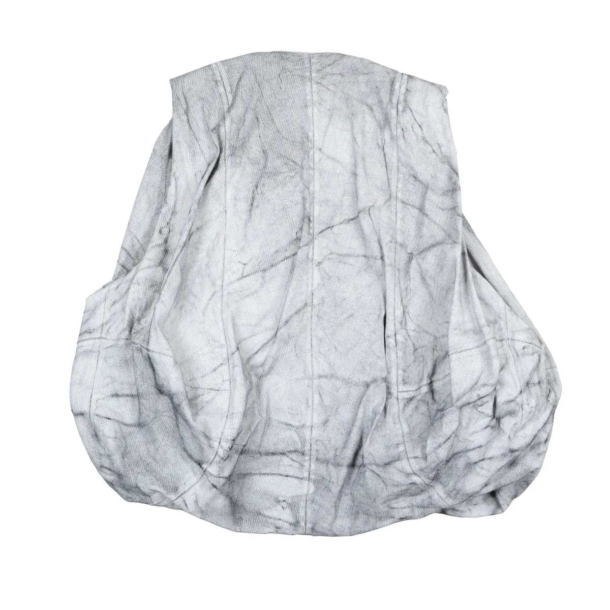 Sleeveless vest constructed with sculptural seamwork to create a rounded, voluminous silhouette. Made from coated denim and washed for a distinctive marbled texture, this piece blends utilitarian design with an experimental edge. Two front welt pockets are subtly integrated for functionality without disrupting the clean shape. An elevated layering piece that brings dimension and depth to any look.