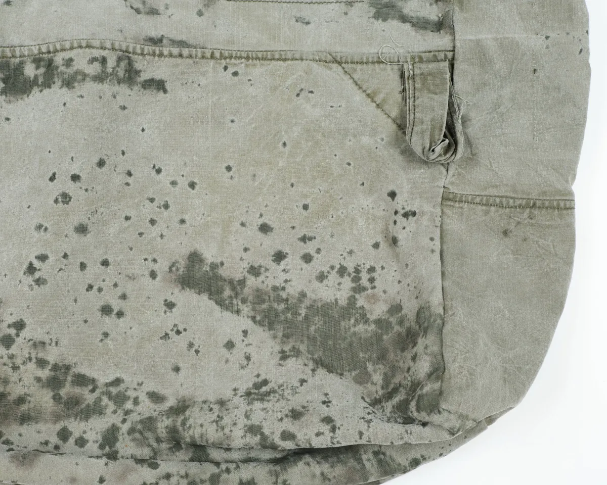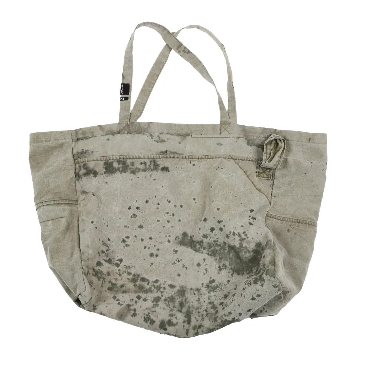 This oversized tote is crafted from a reused military tent made of a poly/cotton blend. Washed at high temperature, the cotton fibers partially degraded, revealing a raised, irregular surface where the polyester remains — creating a naturally textured, almost weather-beaten effect. Features oversized volume, reinforced handles, and original tent details preserved in the design. Each bag is one-of-a-kind.